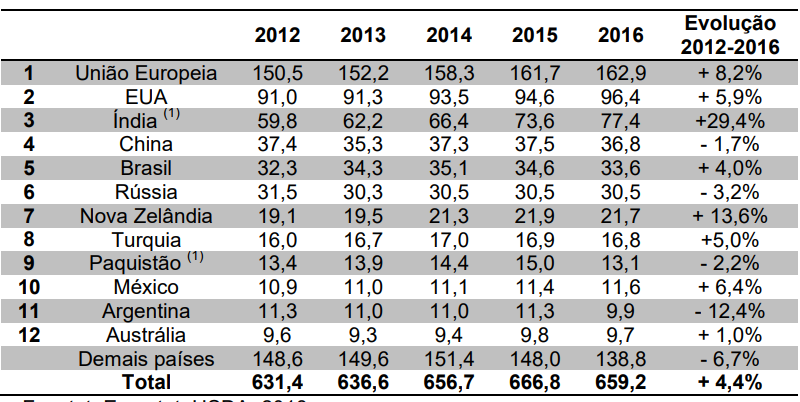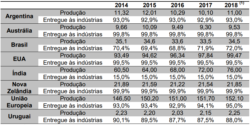 A produção mundial de leite vem aumentando e está se concentrando em alguns países. Os 12 primeiros colocados são os mesmos desde 2010 e significaram 80% da produção em 2016. Índia, Nova Zelândia e União Europeia foram os que mais aumentaram sua produção percentual no período.