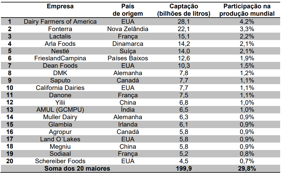 Refletindo a pulverização da produção, as 20 maiores empresas mundiais só conseguiram captar 30% da produção mundial de 666,8 bilhões de litros de leite em 2015. As empresas europeias dominam amplamente esse setor, com 9 empresas entre as maiores. No entanto, a 1ª e a 2ª colocadas são sediadas nos EUA e na Nova Zelândia, respectivamente. Apenas 4 dessas empresas mantêm plantas no Brasil – Fonterra, Lactalis, Nestlé e Danone.