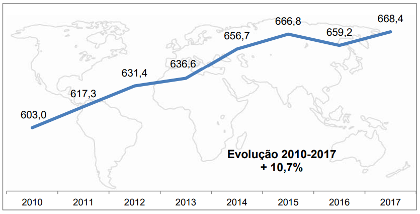 A produção mundial de leite vem num crescente há décadas e essa tendência se mantém nos anos recentes. O crescimento não é linear principalmente devido a situações climáticas que atrapalham pontualmente a produção. Ainda assim, a produção aumentou 11% entre 2010 e 2017, como é visto no Gráfico 2.