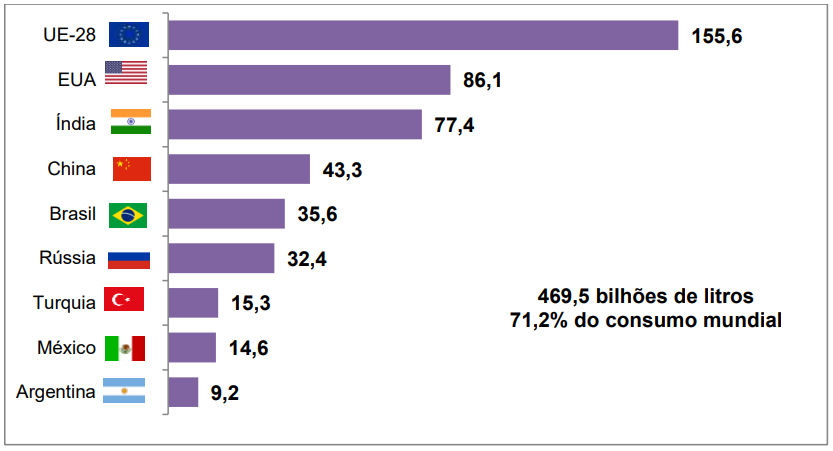 Os maiores consumidores refletem os principais produtores, com a notável exceção da Nova Zelândia, que é o 7º maior produtor, mas exporta quase toda sua produção, pois sua população é pequena.