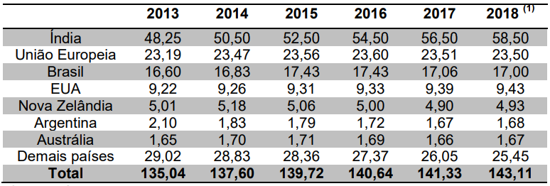 O incremento da quantidade de vacas leiteiras está bastante concentrado na Índia, que aumentou seu rebanho em 10 milhões de cabeças entre 2013 e 2018.