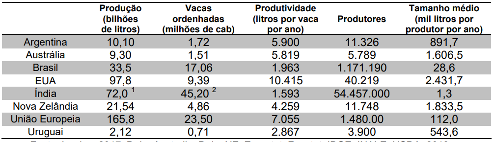 Existe diferença tecnológica significativa entre os países, com a produção dos países ricos tendendo a ser oriunda de sistemas confinados e que demandam subsídio à produção, enquanto nos países emergentes e na Nova Zelândia o sistema produtivo é baseado em pastagens. Por isso, não é adequada fazer comparação direta da produção de leite por vaca, pois a genética e a alimentação dos animais é bastante distinta.
