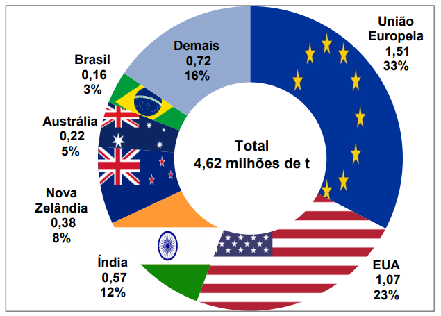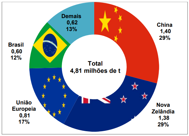 Os 5 maiores exportadores representam 81% do volume, com ampla predominância da Nova Zelândia e participação muito significativa do comércio da União Europeia com terceiros países.