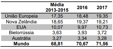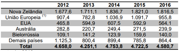 As exportações de lácteos são bastante concentradas na União Europeia, Nova Zelândia e EUA, que suprem 69% do mercado internacional e que vêm aumentando sua participação ao longo dos últimos 15 anos.(Veja no Quadro 17 ).