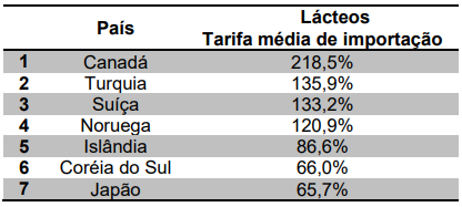 Entre todos os países com maior renda per capita, os que aplicam menores tarifas sobre lácteos são Austrália e Nova Zelândia, como pode ser visto na FIGURA 3.1. Nos EUA a tarifa média de importação de lácteos é de 16,6% e na União Europeia, 37,4%.