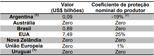 No caso da União Europeia, o pagamento é feito cada vez mais de forma desatrelada da produção, mas ainda alcançou mais de US$ 1,5 bilhão em 2017. Cada país europeu aplica a política de subsídios de forma distinta. Os EUA, por sua vez, transferem subsídios ao produtor de forma direta, atrelada à produção, na forma de suporte ao preço, que alcançaram o valor de US$ 7,5 bilhões em 2016.