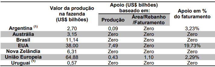 A política agrícola de um país também deve ser considerada no valor dos apoios que protegem e estimulam a produção. Ou seja, não são apenas os pagamentos diretos ao produtor, mas crédito a taxas de juros menores que a inflação, compras públicas e outras políticas também entram no cálculo do apoio que determinado setor recebe.