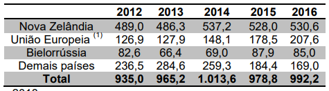 Cabe aqui fazer um recorte sobre o leite condensado, que alcançou comércio internacional de 0,56 milhões de toneladas em 2016 e do qual Arábia Saudita (27% do total) foi o principal exportador, com o Brasil na 5º colocação (4%). Este é o único dos produtos lácteos em que nosso país consegue fazer parte da lista dos maiores, com volumes mais ou menos estáveis há 5 anos.