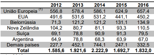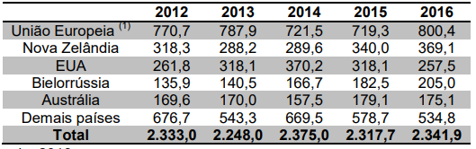 União Europeia e EUA representaram 60% das exportações em 2016. O comércio de soro de leite aumentou 15% entre 2012 e 2016.