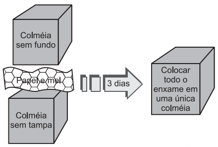 O papel colocado entre as duas caixas separa as colônias e evita brigas entre as operárias. Estimuladas pelo cheiro de mel, elas cortam e eliminam o papel, vagarosamente. Como muitas vezes o enfraquecimento da colônia é por causa de rainhas velhas e cansadas, o melhor é introduzir uma rainha nova, proveniente de um enxame mais produtivo e forte.