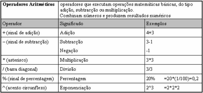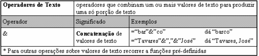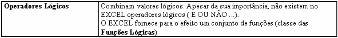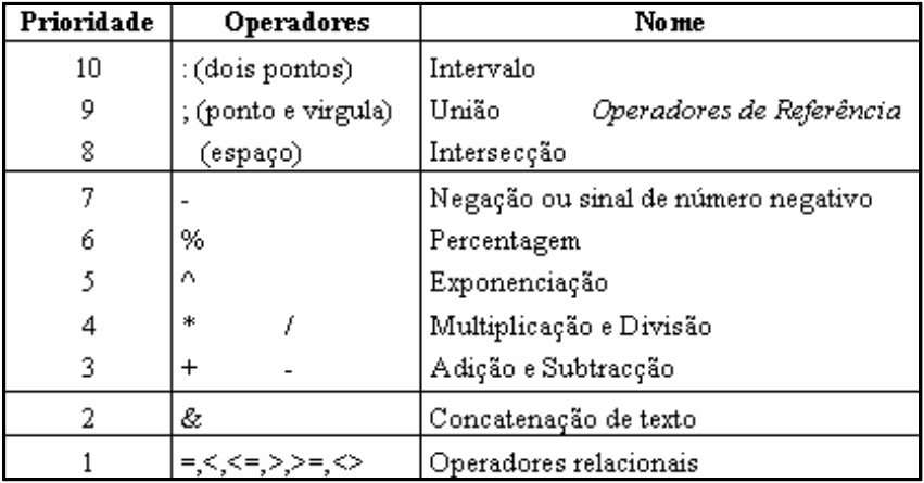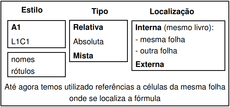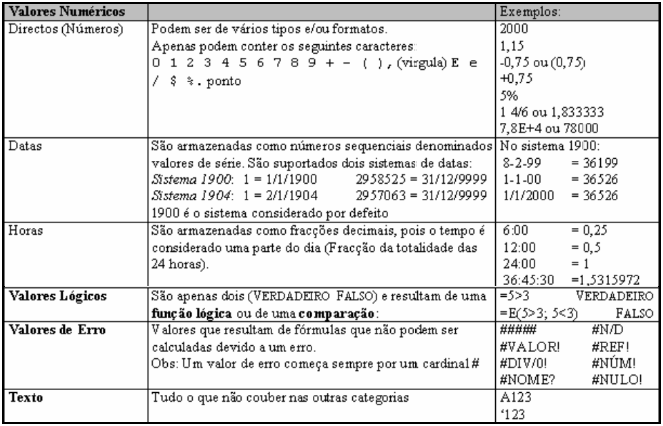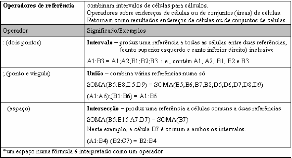 Fórmulas: Operadores e regras de prioridade; Tipos de Valores; Referências a células.