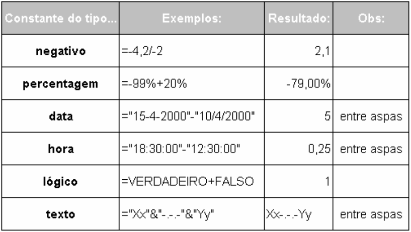 3. Podemos utilizar valores constantes dos tipos: Texto; Numérico; Data; Hora; Lógico