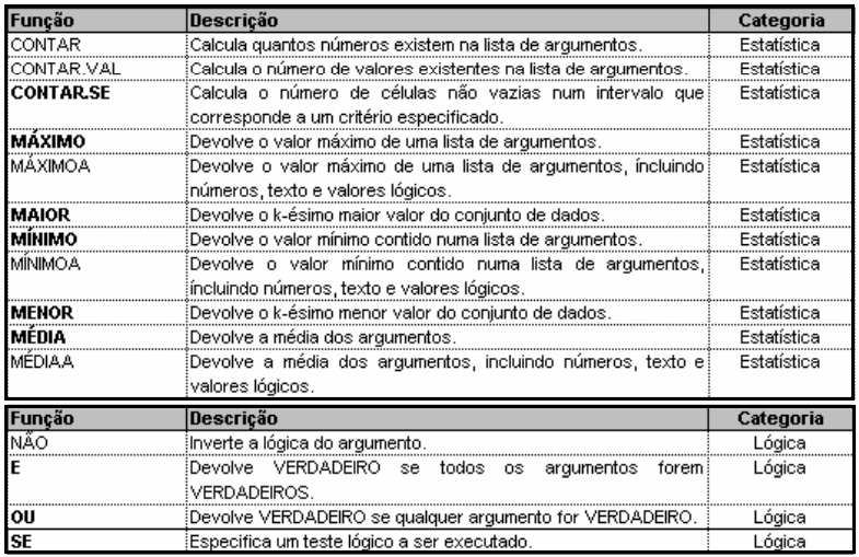 Funções Básicas Mais Utilizadas: SOMA, SOMA.SE, SOMAPRODUTO, ARRED, CONTAR, CONTAR.SE, MÁXIMO, MAIOR, MÉDIA, E, OU, NÃO, SE