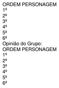 Após ler com atenção o texto, coloque os personagens em ordem de culpa, ou seja, o número 01 como o maior responsável pelo que aconteceu e os demais em ordem decrescente, ficando o número 06 para o menos culpado.