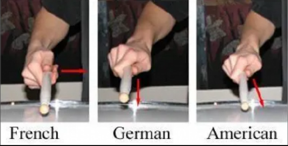 Germany Grip: O polegar fica virado inteiramente para baixo em um ângulo de 90 graus, o trabalho dos pulsos e mais requisitado e o posicionamento das mãos será sempre com o pulso virado para frente.