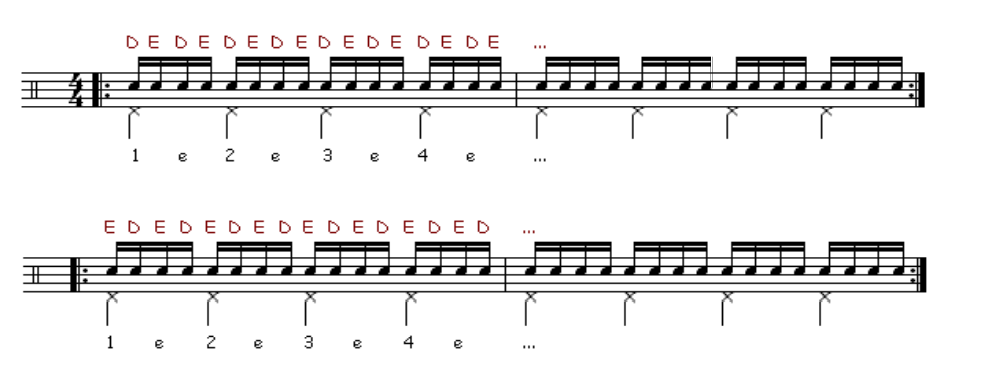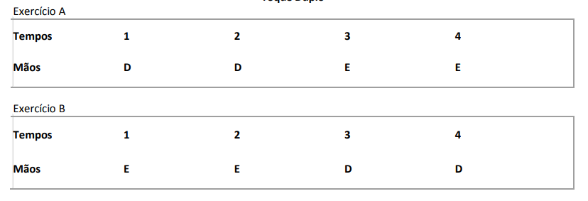 Para cada tempo, devemos executar um toque na caixa, utilizando a mão da baqueta correspondente (D=direita ou E=esquerda). Caso não possua caixa nem borracha de estudo, pratique em qualquer superfície plana (ex.: uma cadeira com uma toalha em cima).