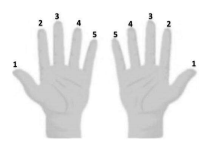 Polegar: 1 Indicador: 2 Médio: 3 Anelar: 4 Mínimo: 5