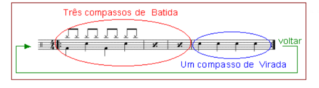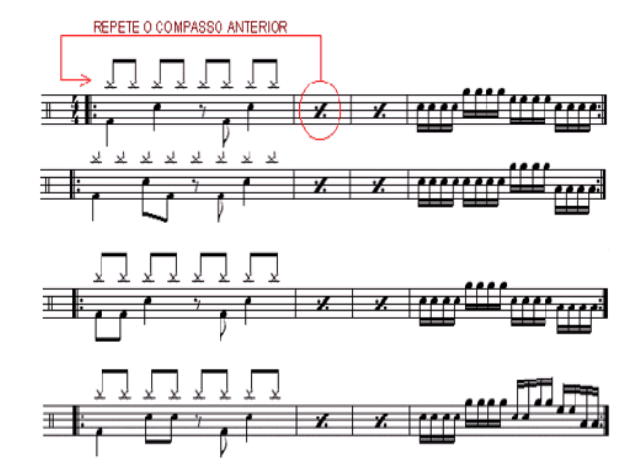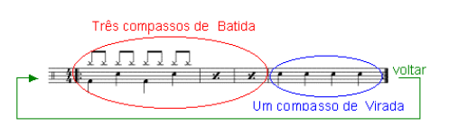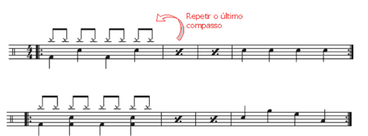 Nestes exercícios vamos executar três vezes a batida, repare no pentagrama os sinais de repetição, e na quarta vez executaremos um compasso de virada.