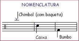 Essas informações no caso da bateria sofrem algumas mudanças, uma vez que, a bateria não é tocada por notas (Dó, Ré, Mi, etc.) como os instrumentos melódicos, porém, a duração de cada nota permanecerá igual. O posicionamento das notas dentro do pentagrama irá representar uma peça diferente na Bateria como: Pratos, Bumbo, Chimbal e outras partes do instrumento. A Clave também sofre mudança, pois a bateria tem a sua própria Clave. O quadro abaixo mostra as principais figuras e o seu posicionamento, que representam as peças da bateria no pentagrama e a clave onde é feita a escrita musical para a bateria.