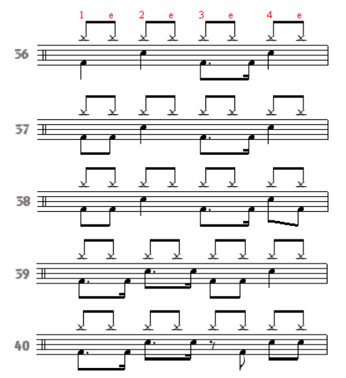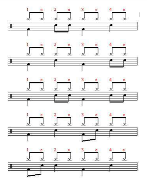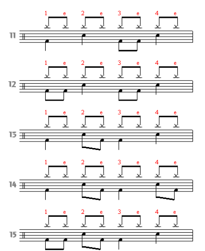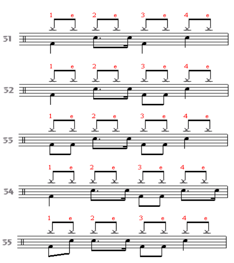 Encerrando as batidas, vamos por último aprender a colcheia pontuada fora do tempo do chimbal e do bumbo, repare, porém, que logo após existe uma batida no bumbo no tempo do chimbal, execute o exercício lentamente para melhor aprendizado e execução correta.