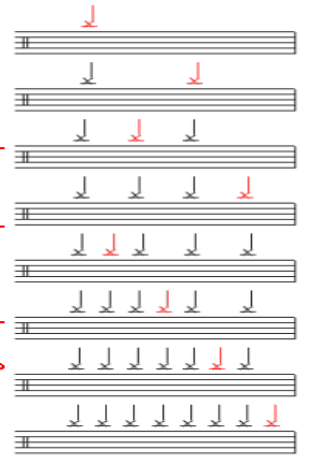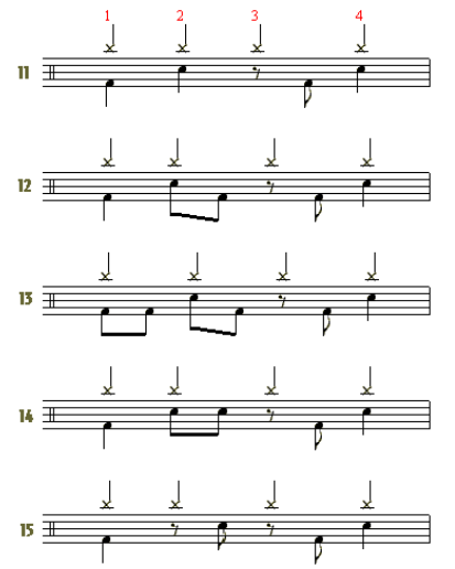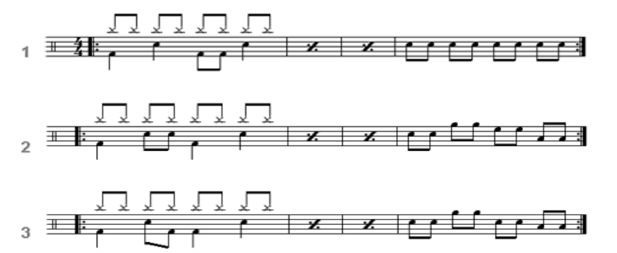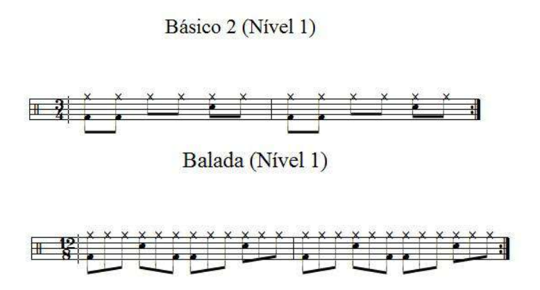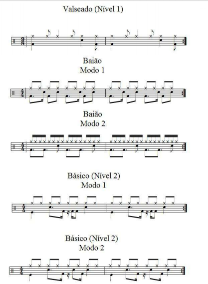 Dicas: Pratique o exercício por linhas. Ex.: toque primeiro o chimbal. Depois acrescente o bumbo. E por fim, acrescente a caixa.