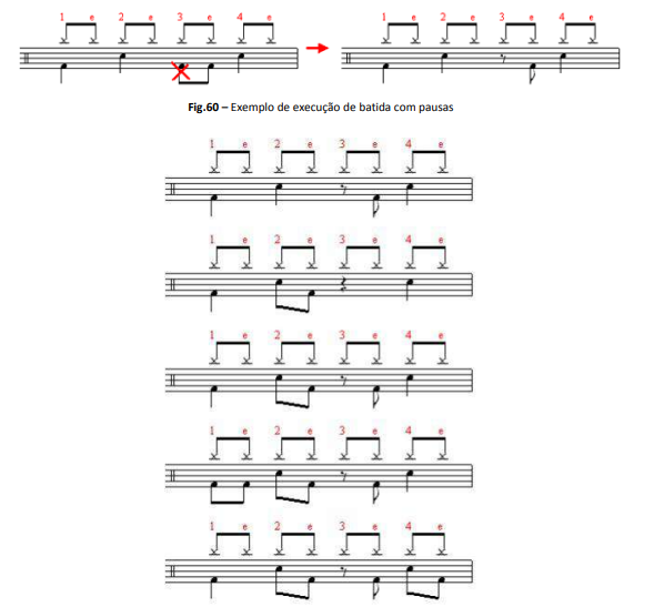 Neste capitulo vamos trabalhar a utilização das pausas, aplicando também o contratempo no bumbo. Analise com muito cuidado o exercício para executar da forma correta e não haver dúvidas. Para entender melhor observe o quadro abaixo: