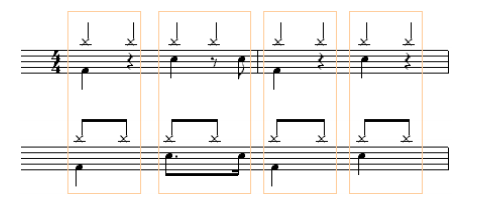 Vamos analisar um exemplo prático de escrita da bateria, utilizando peças diferentes, conforme a nomenclatura acima. Abaixo temos uma batida de bateria em um compasso 4/4. Como todas as figuras rítmicas abaixo são semínimas, segundo a fórmula de compasso, teremos uma semínima por tempo (Caso haja duvidas, retornar ao capitulo anterior). Porém, em cada tempo, temos duas semínimas que serão executadas simultaneamente. No 1° tempo temos: chimbal e bumbo; no 2° tempo: chimbal e caixa; no 3° tempo: chimbal e bumbo; e no 4° tempo: chimbal e caixa. Veja: