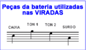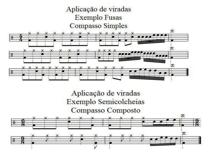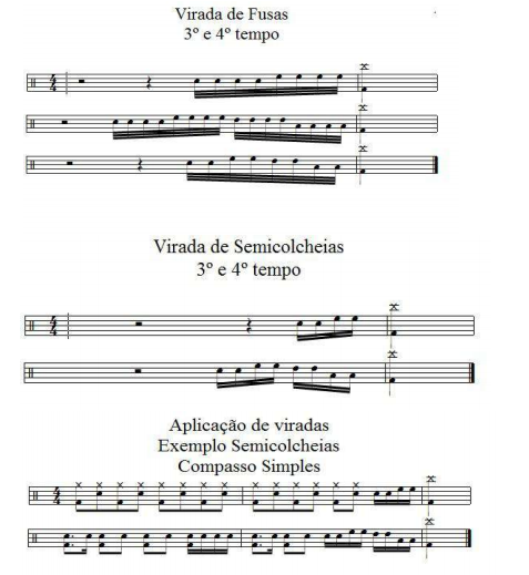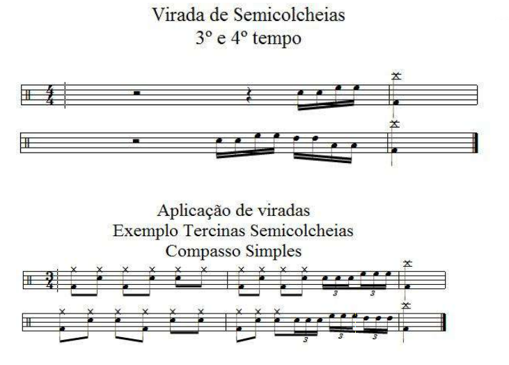 Como visto no exemplo acima, as viradas são feitas em semicolcheias, portanto, quatro toques para completar um tempo cheio, lembre-se que o compasso é quartenário.