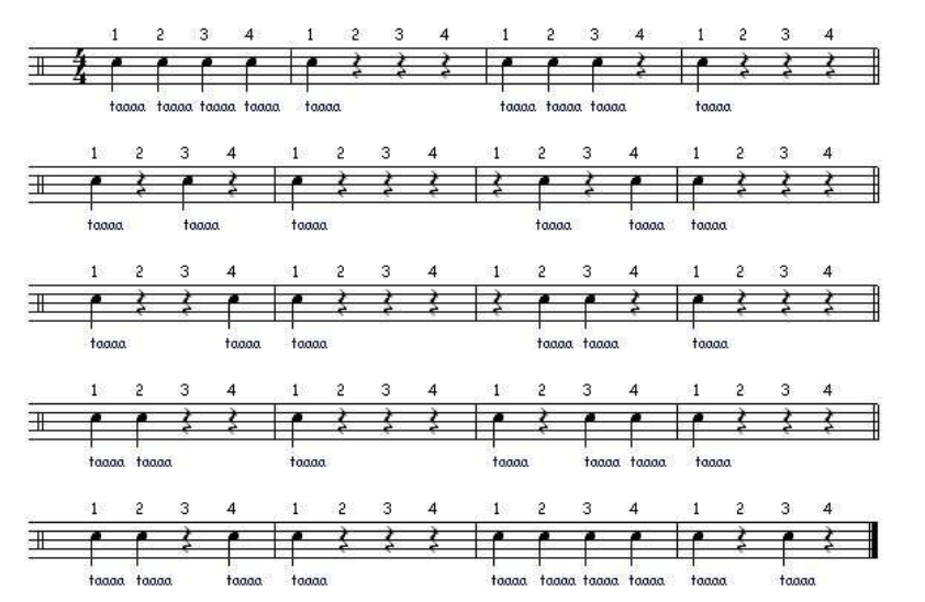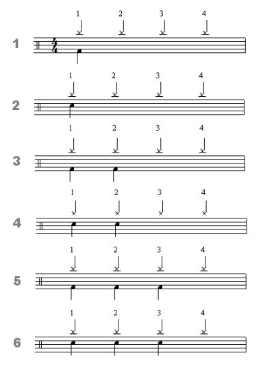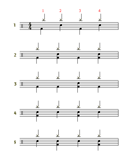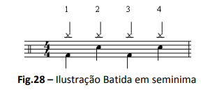 Vamos aprender agora algumas batidas em semínimas, um toque por tempo, este tipo de condução é muito utilizado na música para um maior controle do andamento, tornando o andamento mais rápido ou mais lento. Ele se adequa a vários estilos musicais, pois quando executado lentamente dá a sensação de pouco preenchimento, contudo com os tempos muito bem marcados. Vamos aos exercícios: