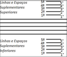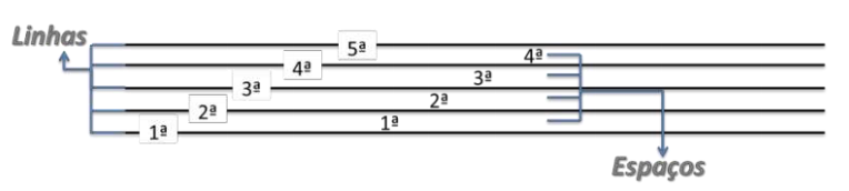 Para a escrita musical utilizamos um modelo de 05 linhas e 04 espaços chamados “Pentagrama”. Nas linhas e nos espaços são escritas as notas musicais (contanto sempre de baixo para cima), conforme abaixo: