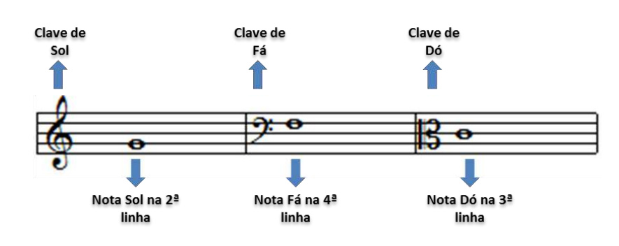 No início do pentagrama há um símbolo chamado clave. Através deste símbolo é possível dar nome as notas no pentagrama. Atualmente, temos 03 três tipos de claves (mais utilizadas):