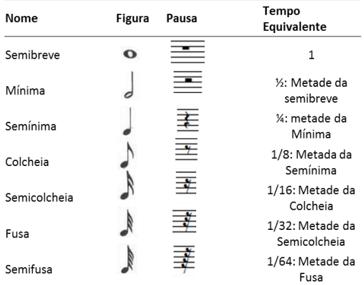Já vimos que para termos a escrita musical precisamos de um pentagrama onde são escritas as notas musicais. Neste próximo item veremos as figuras e seus respectivos tempos musicais, onde para cada tipo de figura existe também um tipo de pausa, demonstrado a seguir:
