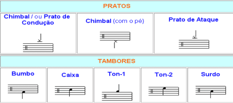 3. Cada peça da bateria é representada por uma figura diferente, temos ainda vários acessórios como pratos de efeito (splash, china...) acessórios de percussão (agogô, bloco sonoro...) que também tem suas escritas especificas, mas, neste capitulo iremos tratar somente das peças básicas da bateria.