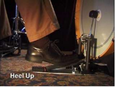 É o contrario da técnica do Heel Down, nela o baterista toca somente com a ponta do pé, com o calcanhar levantado, nesta técnica o baterista trabalha com a musculatura das pernas toda tensionada, o seu desenvolvimento em relação à velocidade é maior, o controle do volume e da pressão no inicio é difícil, principalmente pelo fato de a perna estar relativamente levantada. Esta técnica se aplica tanto ao pedal do bumbo como o pedal do chimbal, observe: