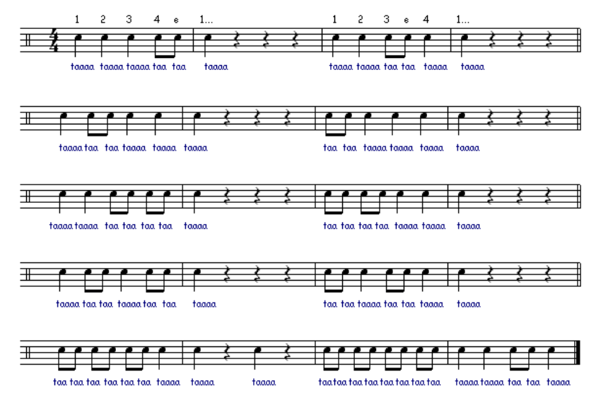 Exercício de leitura rítmica em semínima, colcheia e semicolcheia.