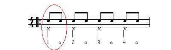 Repare na figura abaixo o sinal indicado dentro do círculo vermelho, este sinal aponta para tocarmos no prato de ataque, ao invés de tocarmos no chimbal, a condução continuará com o chimbal, mas o início da frase será com o prato de ataque, quando for executar o prato de ataque, lembre em fazer o movimento em forma da letra U e não na forma da letra V, para evitar o desgaste dos pratos e também para uma melhor sonoridade, note também que no pentagrama a batida do prato de ataque esta acompanhada por uma semínima no bumbo, execute as duas juntamente, isto dará corpo a execução da nota no prato de ataque. Vamos ao exercício: