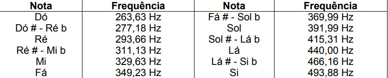 Para termos uma noção melhor de freqüência, vamos comparar as notas musicais com suas respectivas frequências. Os instrumentos musicais são afinados com referência na nota lá (A) da oitava central, cuja frequência é de 440Hz. Temos a seguir uma tabela das frequências das notas na oitava central.
