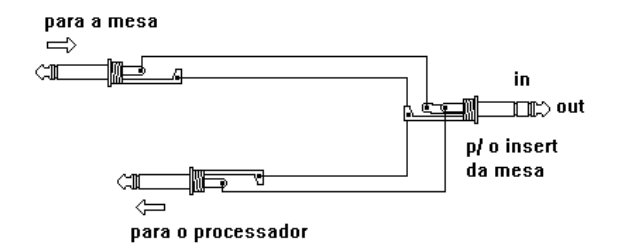 Outra conexão que pode existir nos canais, subgrupos e master é a insert, que pode aparecer como um único jack P10 estéreo ou jacks in e out. As conexões de insert são como se a fábrica da mesa deixasse que nós ligássemos outro equipamento direto no circuito, abrindo-o e enviando o sinal para algum equipamento que o processaria e devolveria o sinal processado no mesmo local (no meio do canal antes do fader ou antes do fader do master). Usamos as conexões de insert para ligação de outros equipamentos ou como direct outs. Direct outs são saídas ligadas junto com o conector de entrada do canal para que se possa enviar o sinal para um gravador ou para outra mesa. Quando existe apenas um jack insert usamos cabos "Y" para a ligação de algum equipamento, no caso inserimos o plugue P10 pela metade (até a primeira trava) para o insert funcionar como direct out.