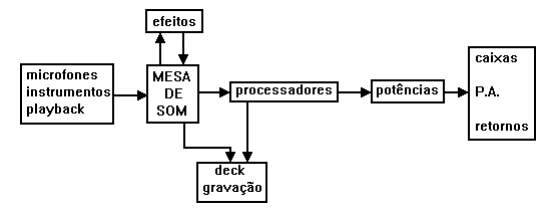 Ligamos microfones, instrumentos e playbacks na mesa. Como já comentamos quanto aos efeitos, mandamos o sinal da mesa para eles através de uma saída auxiliar e retornamos por um canal ou aux return. Ligamos os processadores um seguido do outro, ou através de cabos Y nos inserts. Na primeira maneira ligamos a saída de um equipamento na entrada do próximo. Quando utilizamos inserts, ligamos o “pé” do Y no insert desejado da mesa e ligamos as outras pontas, conforme a pinagem mais adiante, na entrada do primeiro equipamento e a outra na saída do último; interligamos os equipamentos com cabos da saída de um para a entrada do outro. A vantagem de utilizarmos os inserts das mesas é de manter um cabeamento mais organizado, além de facilitar a utilização do multicabo que pode ser ligado só na mesa, sem precisar ser esticado até um rack. Após os processadores, o sinal chega as potências, indo então para as caixas acústicas. PA e retorno utilizam potências e processadores diferentes; os retornos são ligados a partir das saídas auxiliares e as potências a partir do master da mesa. P.A. é abreviação de “Public Address” e é o som que é dirigido ao público. Os sides são uma espécie de mini P.A. que funcionam como retornos e são encarados como tal. Dentro desse esquema podemos ligar uma aparelhagem simples com mesa, equalizadores (PA e retorno), compressores (PA e retorno) potências e caixas (PA e retorno); ou qualquer outro sistema mais completo e complexo, com dúzia de equipamentos de efeito e processadores.