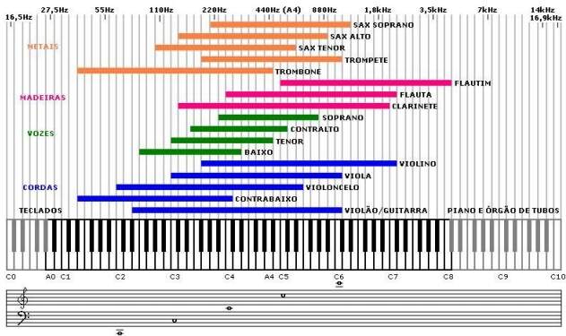 Para obtermos as notas uma oitava abaixo, dividimos sua freqüência por dois. Para obtermos as notas uma oitava acima, multiplicamos por dois; duas oitavas por quatro; três oitavas por oito... A figura 1 seguinte, que será de grande valia para equalização, mostra a tessitura dos instrumentos e das vozes, bem como suas relações com as freqüências. A tessitura indica quais notas o instrumento, ou a voz, é capaz de emitir; ou em outras palavras, quais freqüências cada instrumento, ou voz, produz.