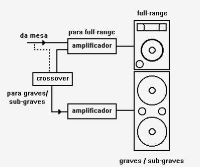 Obviamente alguns equipamentos possuem seu lugar correto nesse esquema. Por exemplo o mais usual é deixar compressores gerais (para master e auxiliar) após equalizadores e imediatamente antes do amplificador ou, caso exista, antes do crossover. Ficando a seqüência para P.A e retorno: mesa - equalizador - compressor - amplificador - caixas acústicas. A próxima figura mostra um exemplo de ligação de um sistema de sonorização. A seqüência crossover-amplificador-caixas será explicada logo a seguir.
