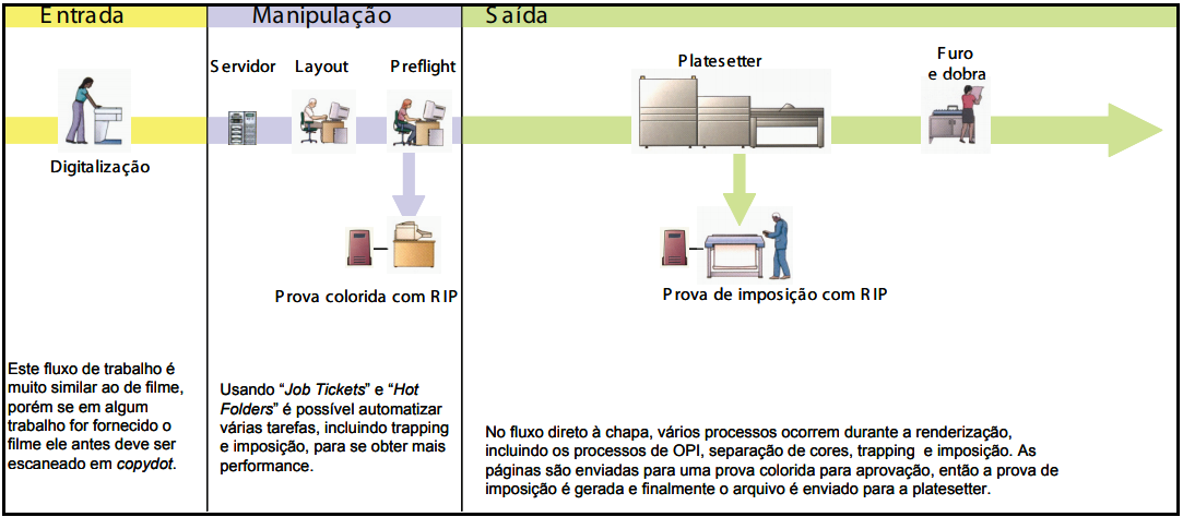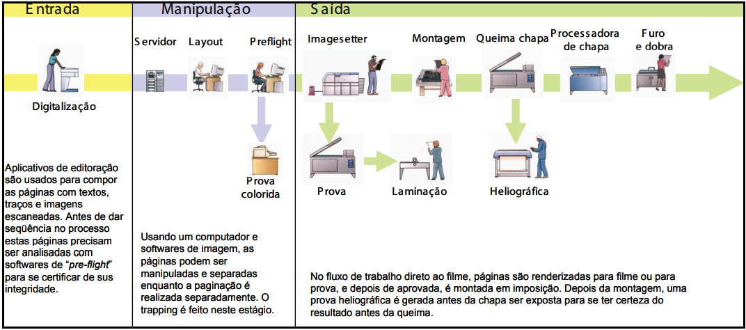 1.Saída em filmes: Os arquivos das páginas separadas formarão os arquivos de imposição (colocação das páginas no formato da impressora) para impressão em grande formato (ou formato de folha inteira). Será dada saída em filme, e esse filme (fotolito) serve para gravar as matrizes (chapas) de impressão.