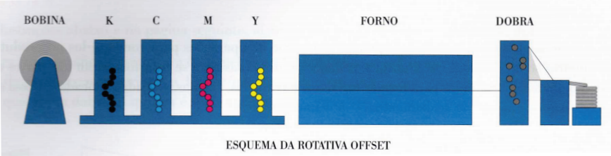 Cores: O sistema de impressão Offset imprime 4 cores básicas: Cyan (azul), Magenta (rosa), Amarelo e Preto. A essas 4 cores damos o nome de tintas de escala, ou de processo (Process). A partir dessas 4 cores obtêm-se todas as cores do espectro visível. As fotografias coloridas de uma revista são impressas nas 4 cores básicas. A imagem, dividida em linhas de pontos (retícula), mistura as porcentagens de cor impressa, juntamente com o branco do papel. O olho humano mistura as cores, formando a imagem colorida.
