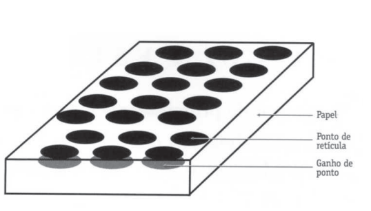 Ganho de ponto: Pontos e linhas finas imprimem mais largas do que são no arquivo, nas chapas e nos fotolitos, reduzindo detalhes, abaixando contraste, fazendo com que tipos pequenos apareçam mais “gordos” e, às vezes, alterando tonalidades de cor