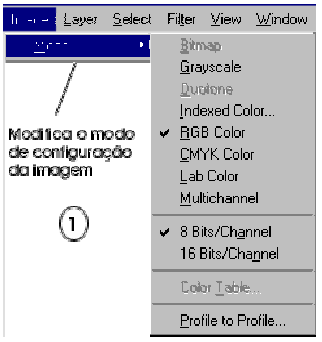 CMYK color: Converte a imagem par o modo CMYK, que utiliza as quatro cores usadas na separação de cores no processo de impressão: C (cyan/ ciano), M (mangenta), Y (yellow/ amarelo) e K (black / preto). As imagens CMYK possuem quatro canais contendo 24 bits por pixel. Somente os arquivos Bitmap e Multichannel não podem ser convertidos para este modo.