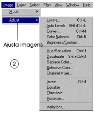 Replace color: modifica também a cor, saturação da cor e o brilho da imagem. Selective color, Channel Mixer, Invert, Equalize, Treshold, Posterize, Variations