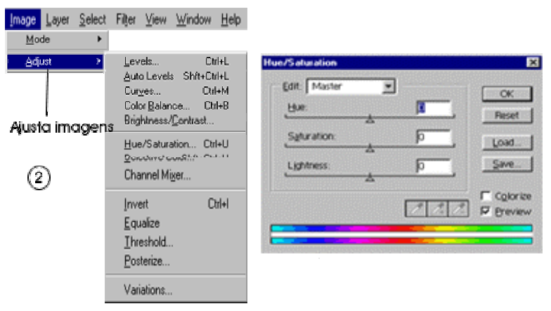 Hue/satation: ajusta as cores (matizes), suas saturações e brilho. Você pode alterar uma cor por vez, conforme o modo de cor da imagem. Para imagens em RGB, altere R, G e B. Para imagens em CMY, altere C, M e Y. Em Master, todas as cores são alteradas ao mesmo tempo.