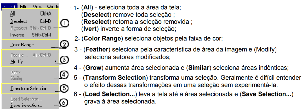 A maioria das Operações iniciam com uma seleção. Este comando permite selecionar partes da imagem que não se tocam e você pode combinar seleções de várias maneiras. Você pode também fazer vários modos - tais como pintar sobre a área selecionada ou usar a ferramenta Pen para desenhar um contorno preciso da área a ser selecionada. Você também pode salvar as seleções para o futuro.