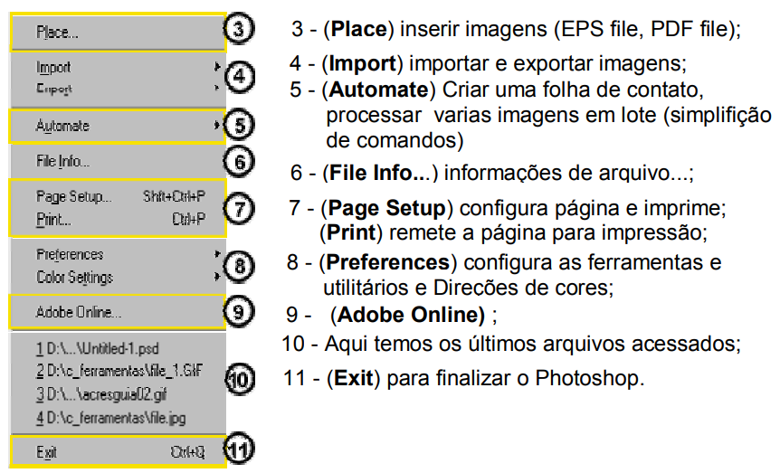 Save As- permite salvar o arq. com nome diferente do atual, permitindo assim obter-se várias versões de um mesmo trabalho, ou mesmo nome em outro diretório e/ou driver, ou ainda com extensões diferentes: *.PSD, *.PDD, *.JPG, *.TIF, *.BMP, etc...