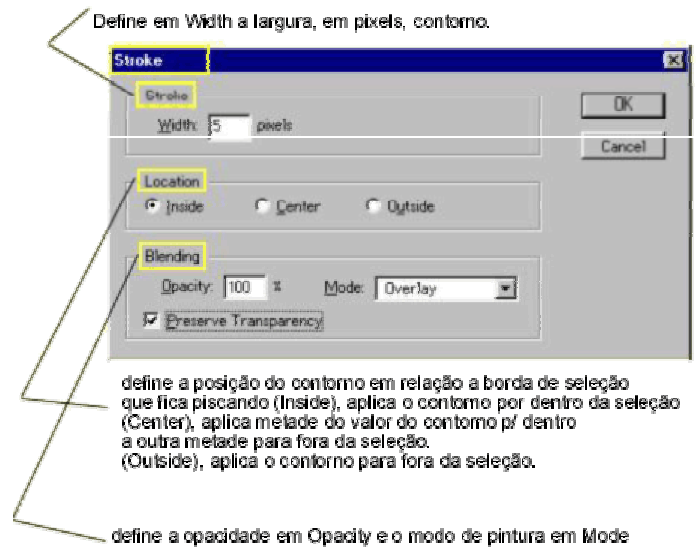 (Stroke):Permite o preenchimento de uma borda ao redor da área selecionada, como um contorno ou moldura.